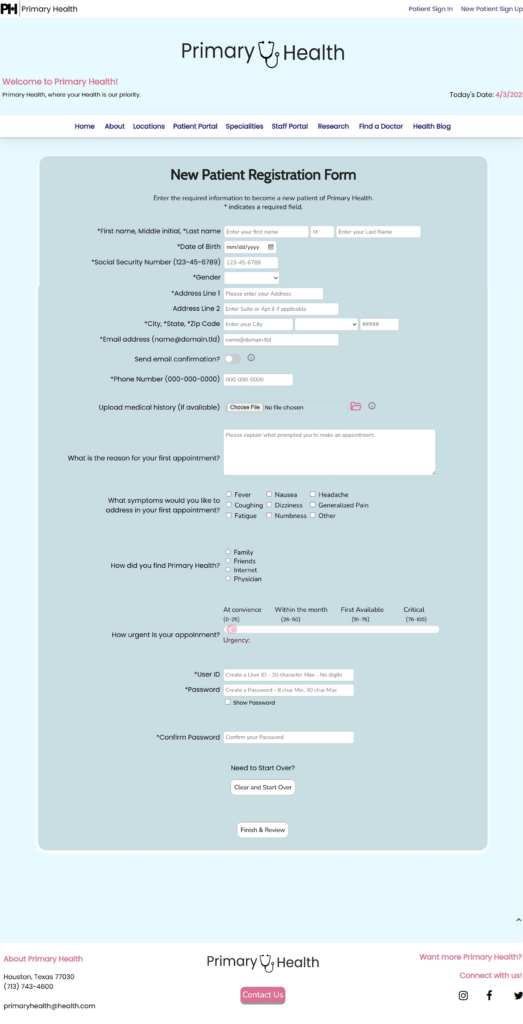Objective: Design, code, and create a prototype homepage and new patient form for a theoretical company utilizing HTML5, CSS3, and JavaScript. Consider user experience throughout while incorporating varied button formats and event-responsive elements.